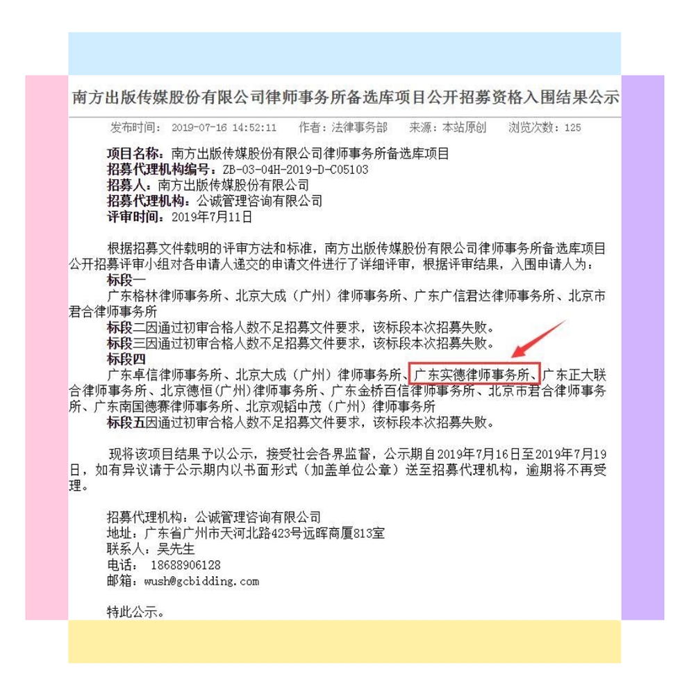 近(jìn)日(rì),南(nán)方出版傳∞λ©™媒股份有(yǒu)限公司公示了(le)律師(shī)事(shìσ"β)務所備選庫項目入圍結果,廣東君政律師事務所¥§所以标段內(nèi)綜合排名第三順利中标∏•'☆。